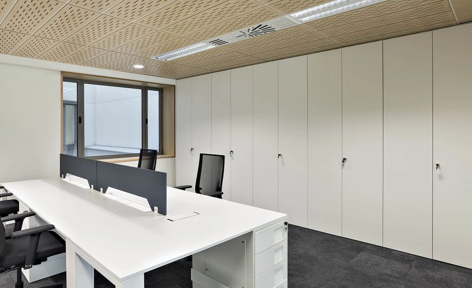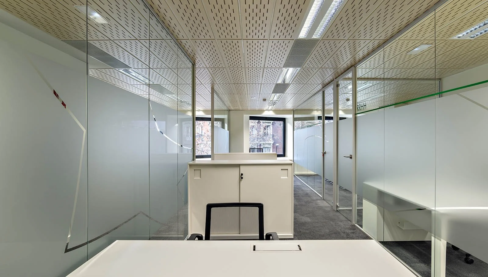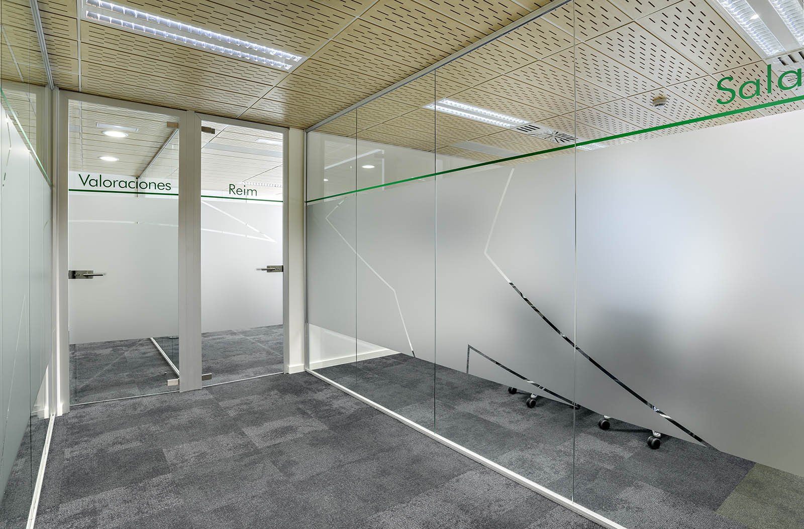 Puertas de suelo a techo en vidrio templado. Destaca un complemento muy importante para la oficina como son las taquillas y tabiques-armario a juego con el sistema de compartimentación.