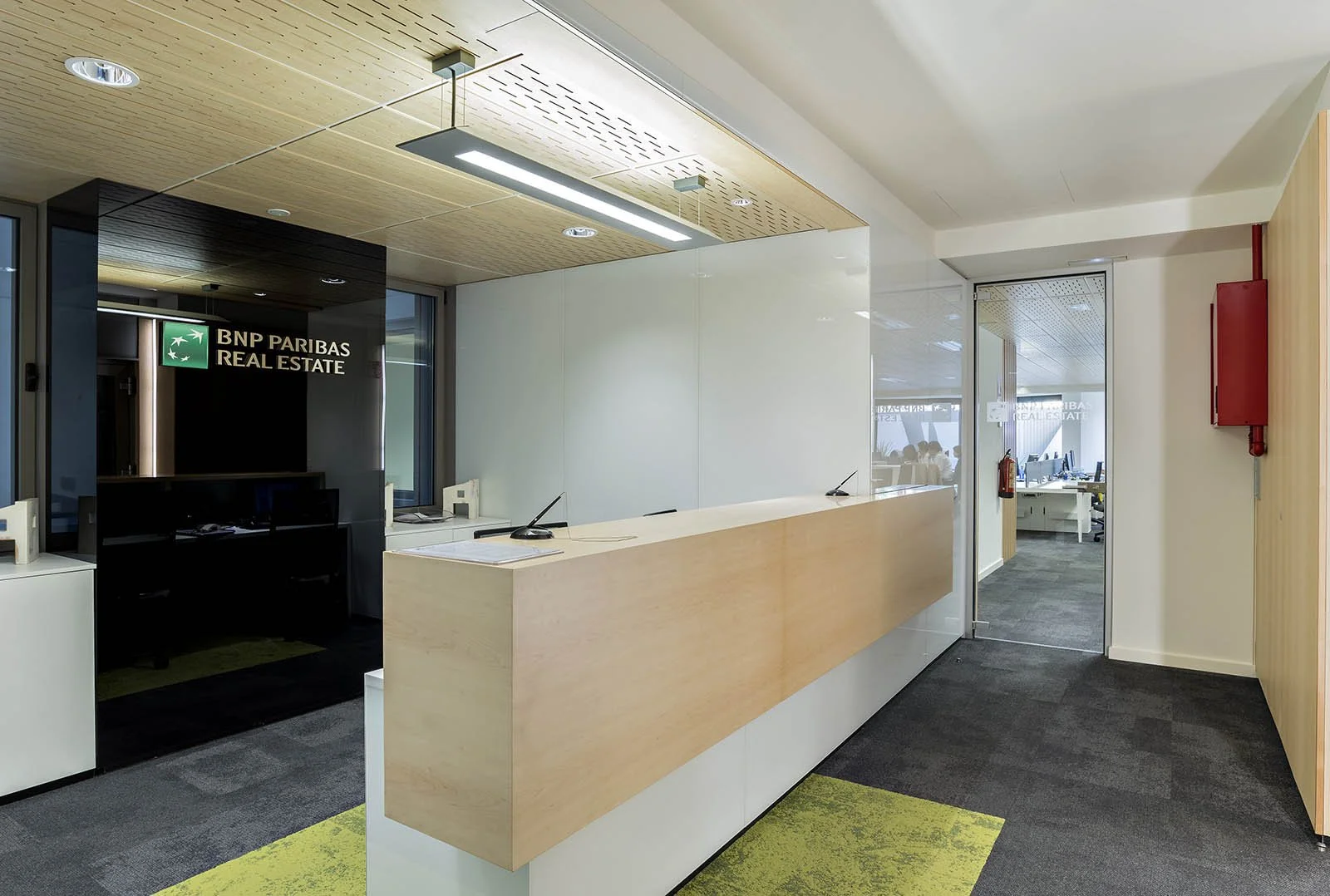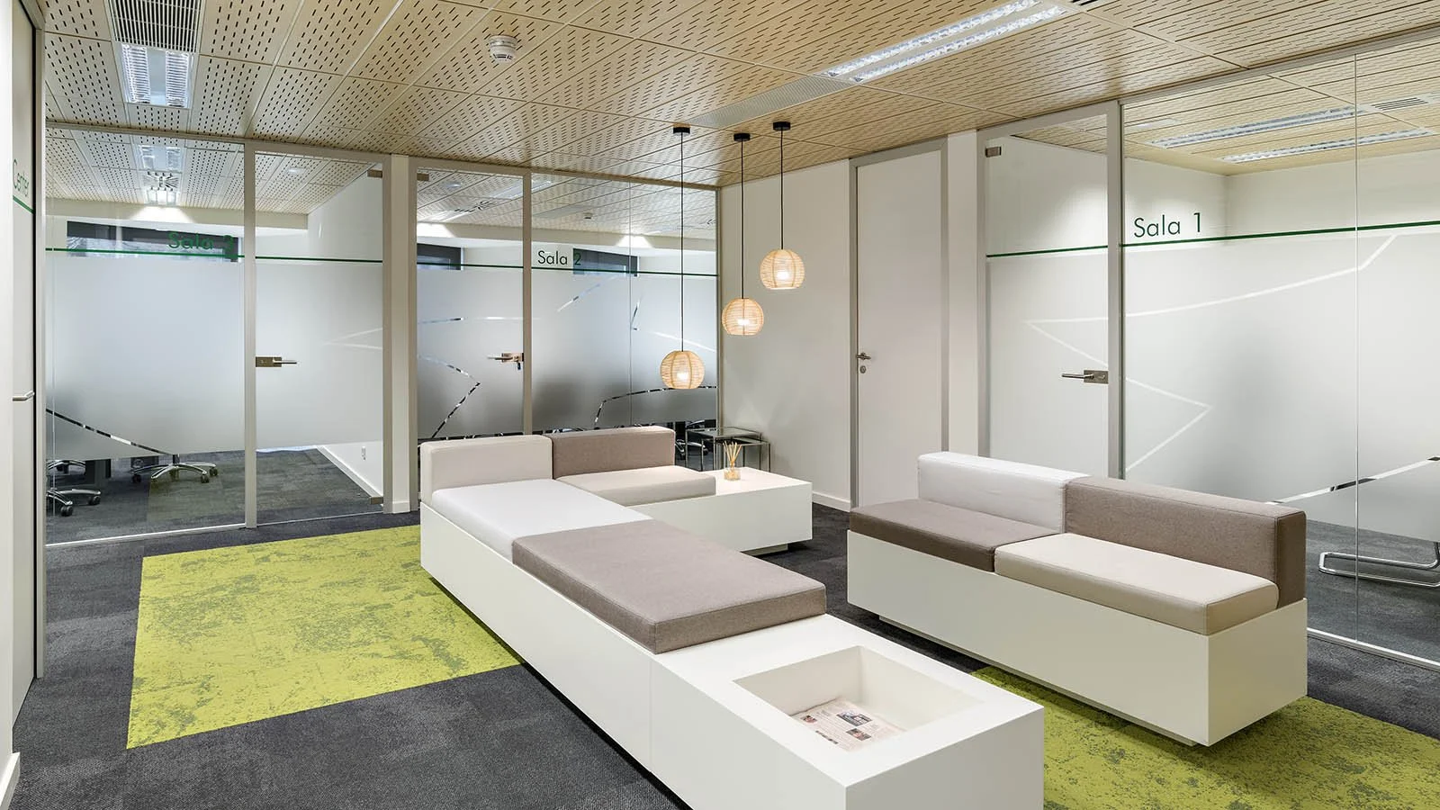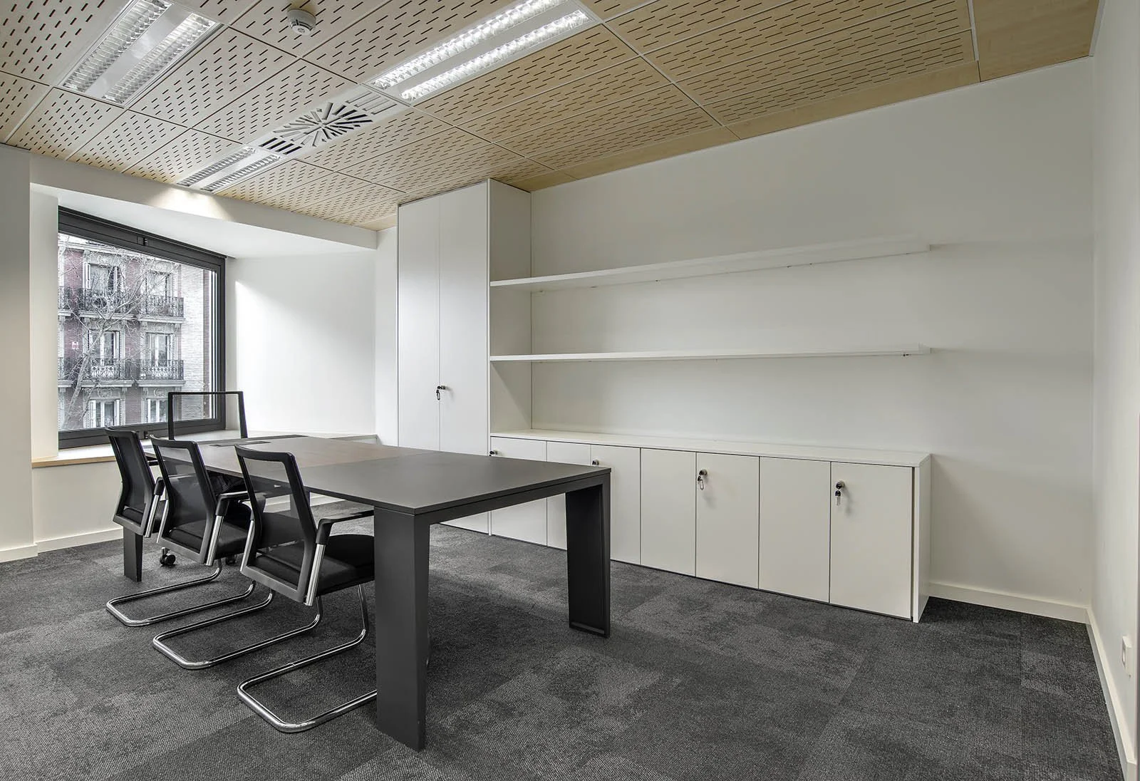 Puertas de suelo a techo en vidrio templado. Destaca un complemento muy importante para la oficina como son las taquillas y tabiques-armario a juego con el sistema de compartimentación.
