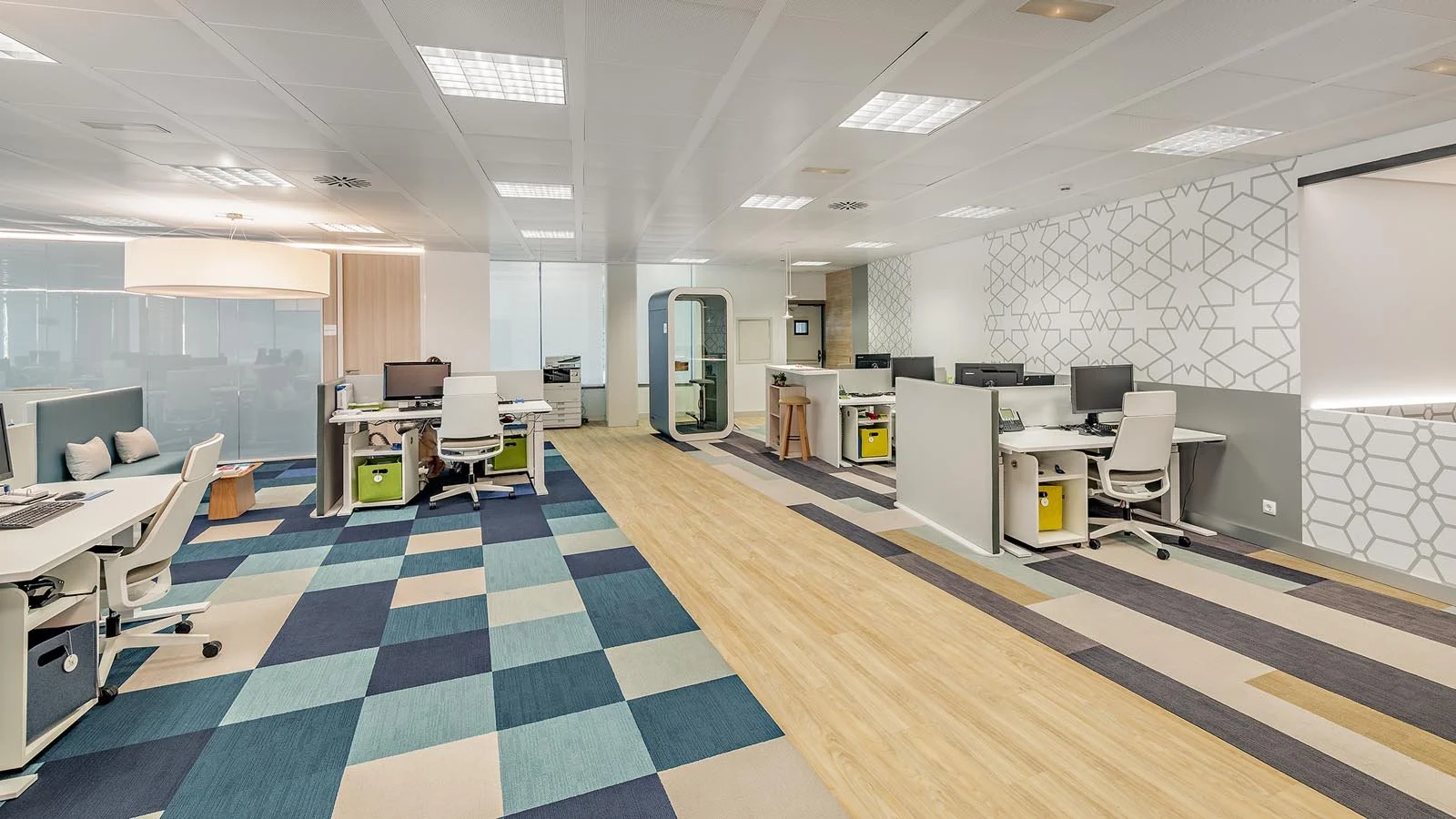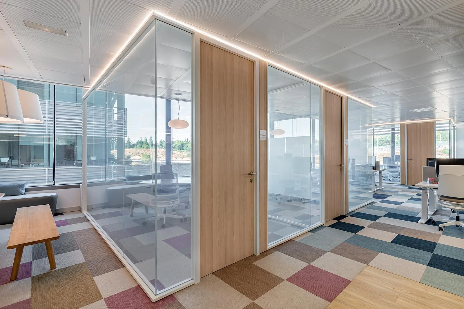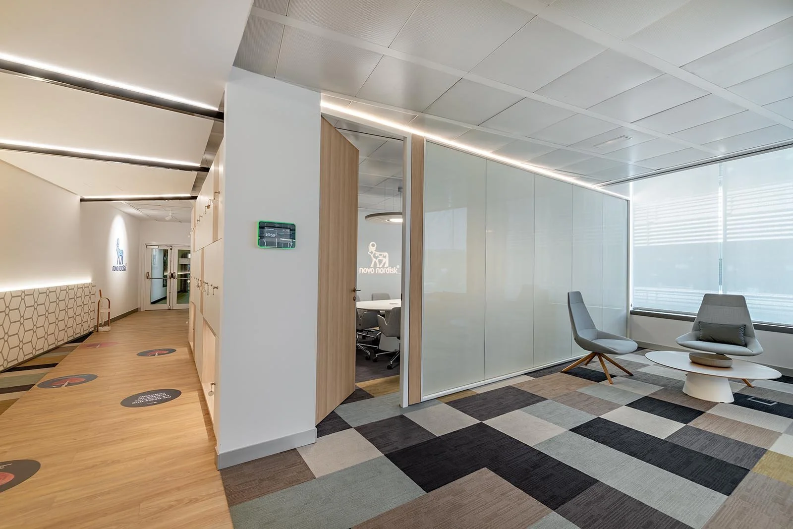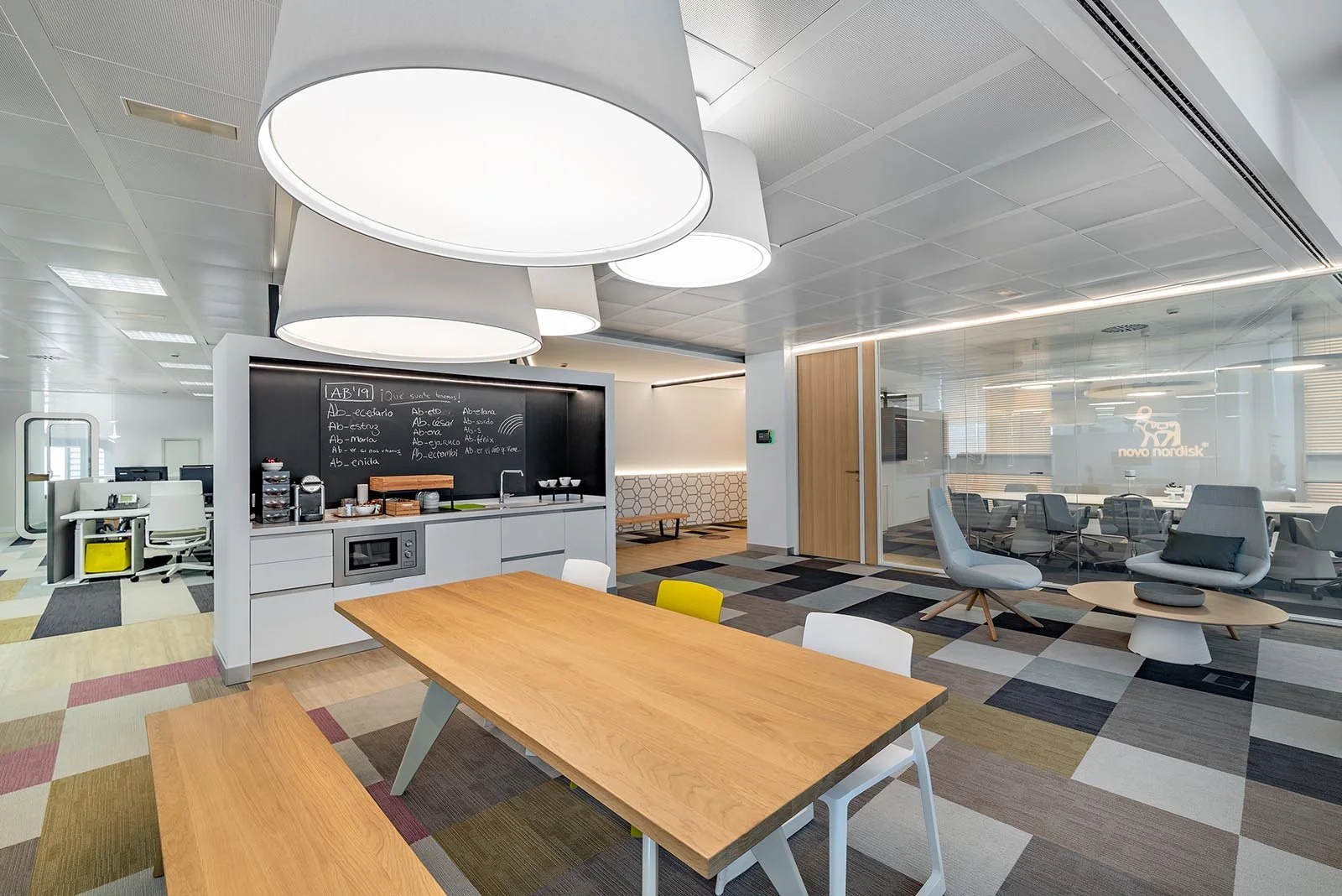 La farmacéutica danesa Novo Nordisk requería de espacios multifuncionales que se adaptasen a diferentes situaciones. En esta línea, se deseaba apostar por un estilo actual donde primasen los ambientes luminosos y amplios, pero sin renunciar a la privacidad necesaria en ciertos momentos. La solución pasaba por la instalación de nuestras mamparas UMA con vidrios de privacidad. Era justo lo que precisaban.