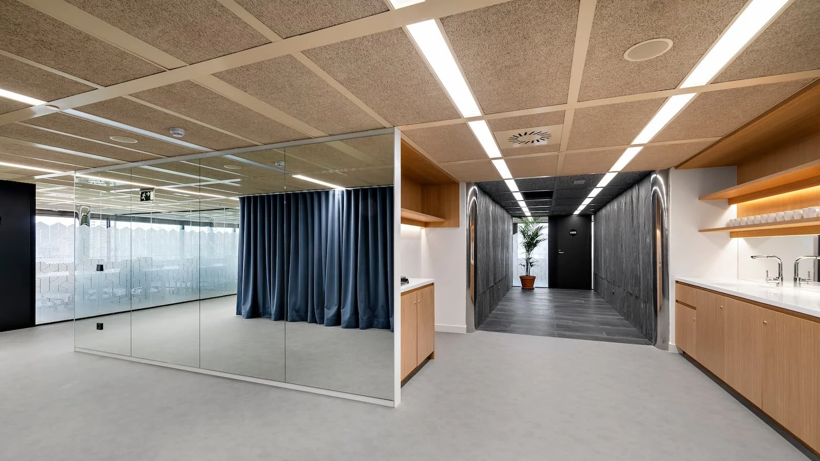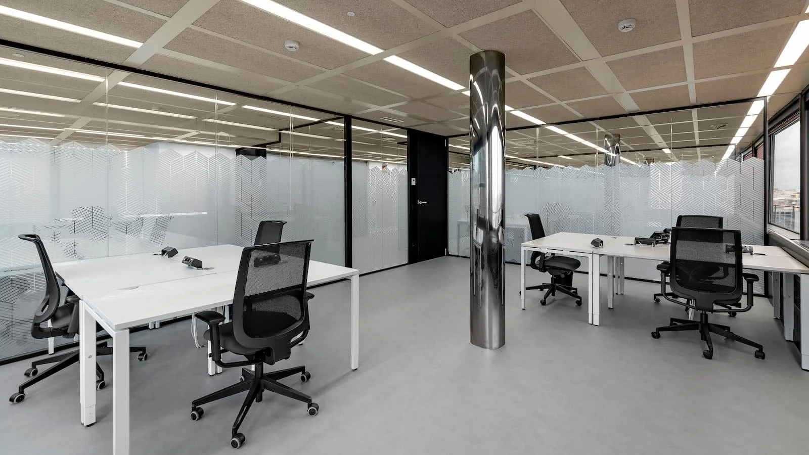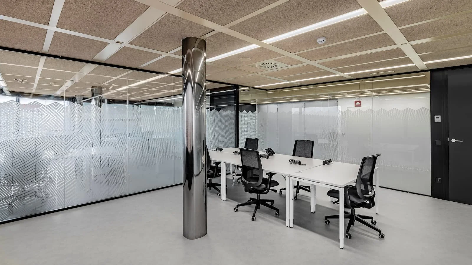El proyecto de Spaces, en la calle madrileña de Castellana, consta de tres plantas de oficina. De ellas, dos presentan una altura standard de 2,45 metros, donde instalamos nuestro modelo de mampara R-66 simple vidrio y doble vidrio, dividiendo la planta en diferentes despachos, con puertas de madera y acabado en melamina negra.