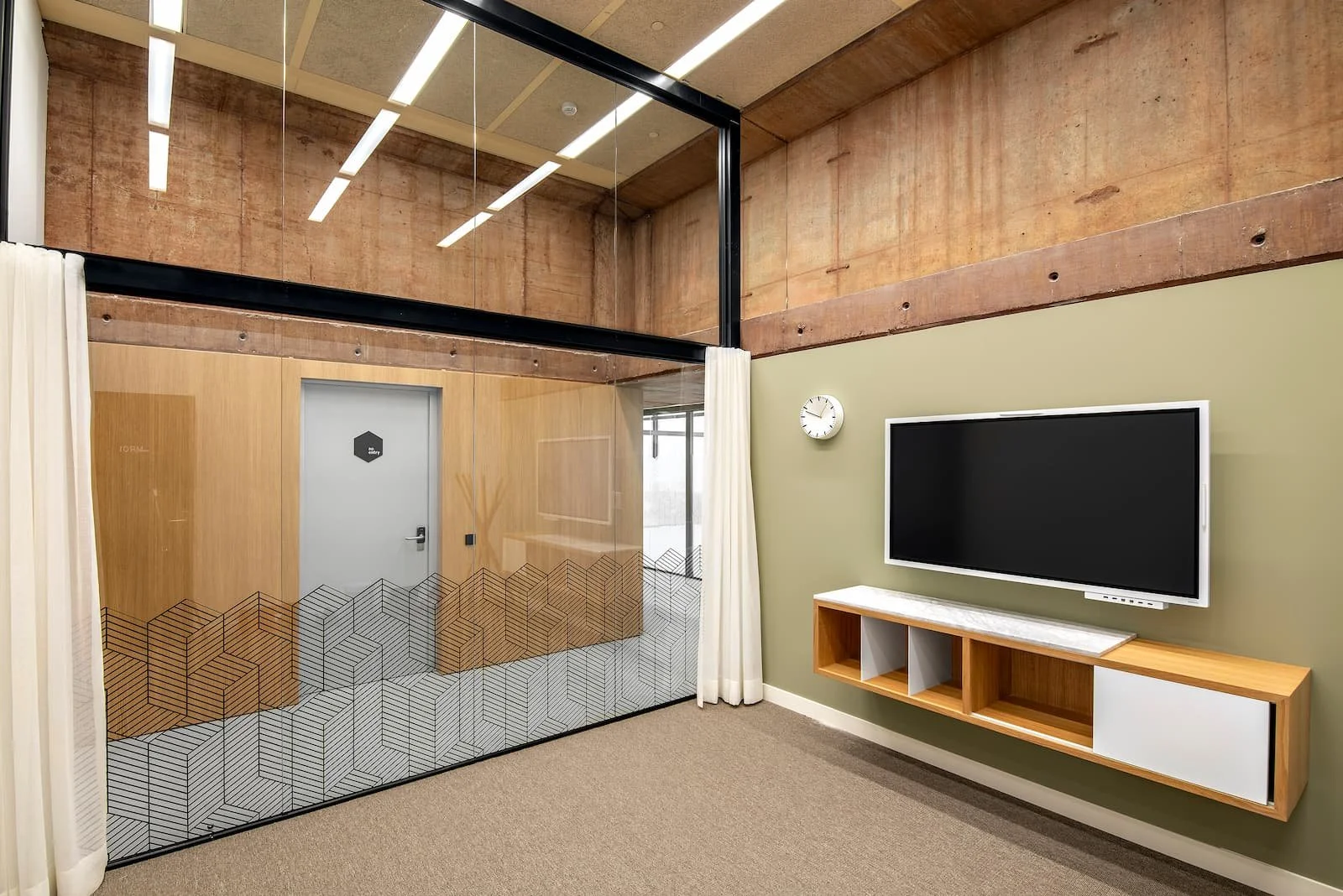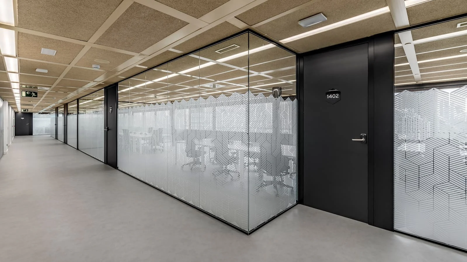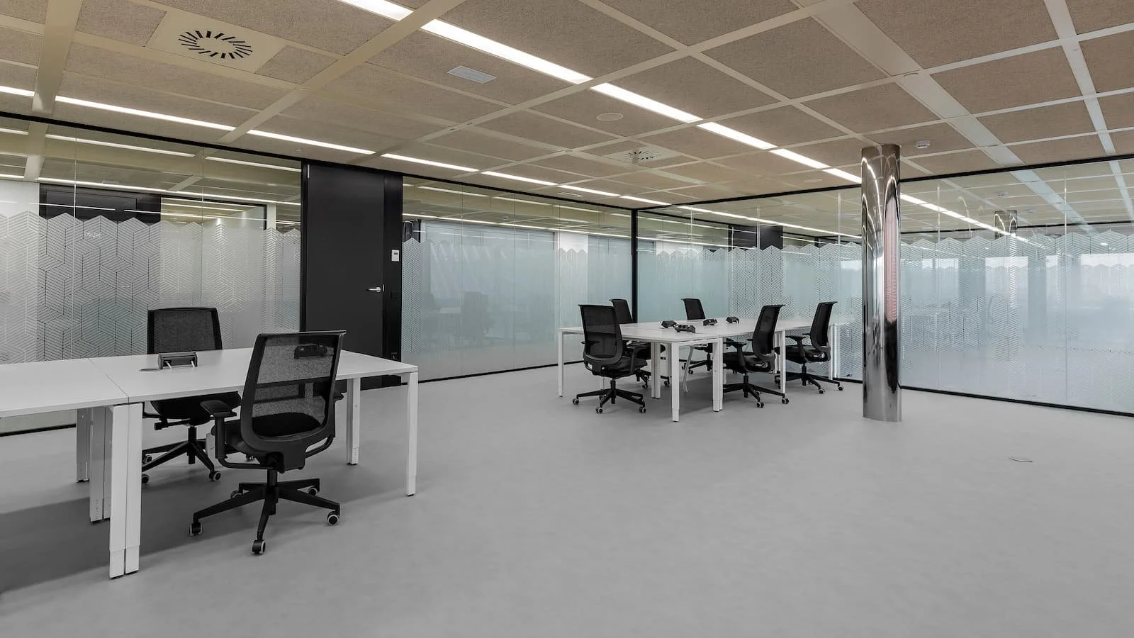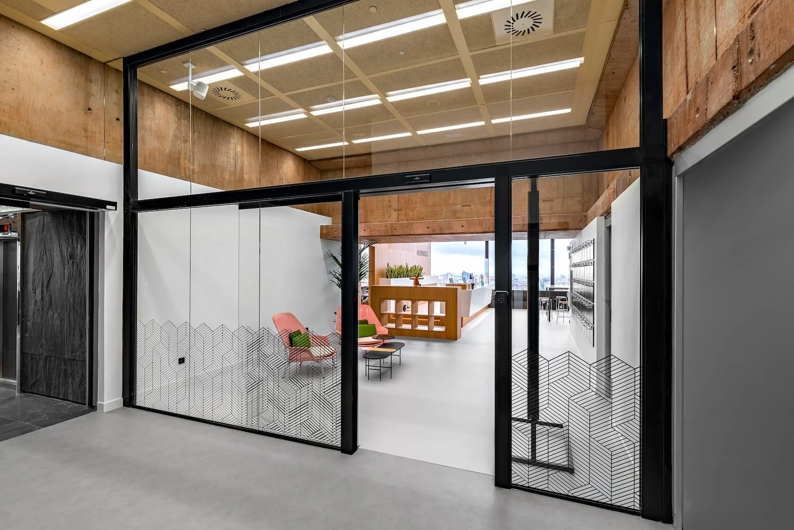 El proyecto de Spaces, en la calle madrileña de Castellana, consta de tres plantas de oficina. De ellas, dos presentan una altura standard de 2,45 metros, donde instalamos nuestro modelo de mampara R-66 simple vidrio y doble vidrio, dividiendo la planta en diferentes despachos, con puertas de madera y acabado en melamina negra.