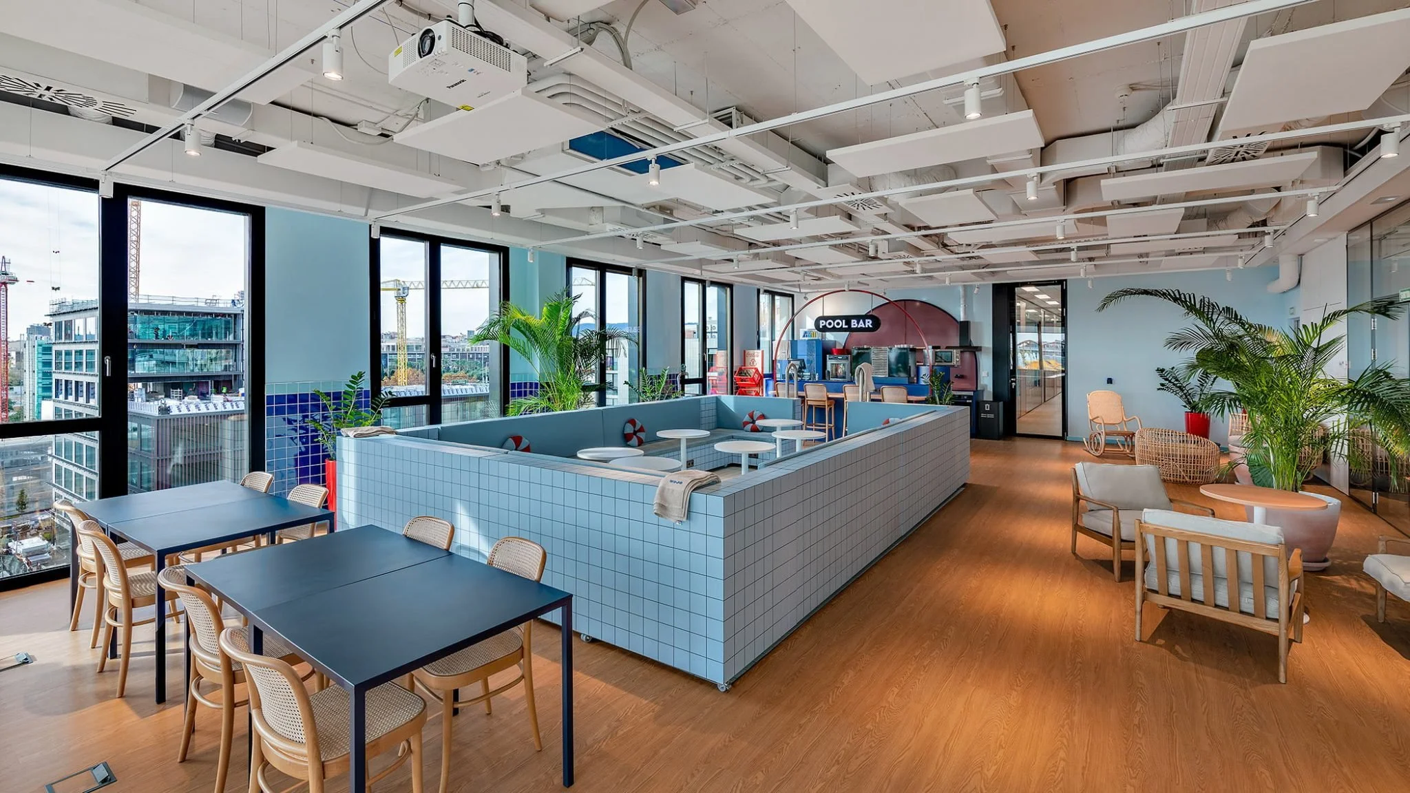 También hemos realizado la mayor parte de carpintería a medida: el bar de planta baja, el mueble Calme con arco azul, los bancos en plantas, todos los offices de las plantas, los soportes de pizarra donde van los TV, zócalos de más de 20 colores diferentes, entre otros elementos totalmente personalizados.